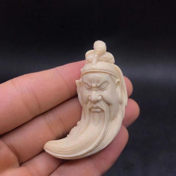 猛犸象牙3A冰料,金亮大师亲工雕刻作品。开脸是威武霸气的,造型犹如一把关公大刀,同时背后雕刻一条很霸气的龙。这是一款满工雕刻的关公吊坠,克重是20多克左右,佩戴舒服不会很沉。