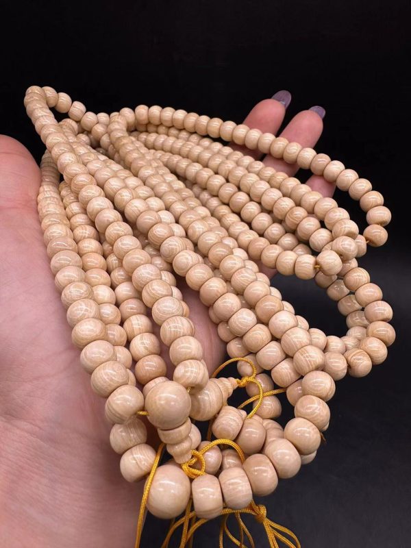 天然猛犸象牙粉色咖啡材料,色泽奶咖,牙纹很清晰,没有色差,老型咖啡手串。尺寸6x8mm,108颗。